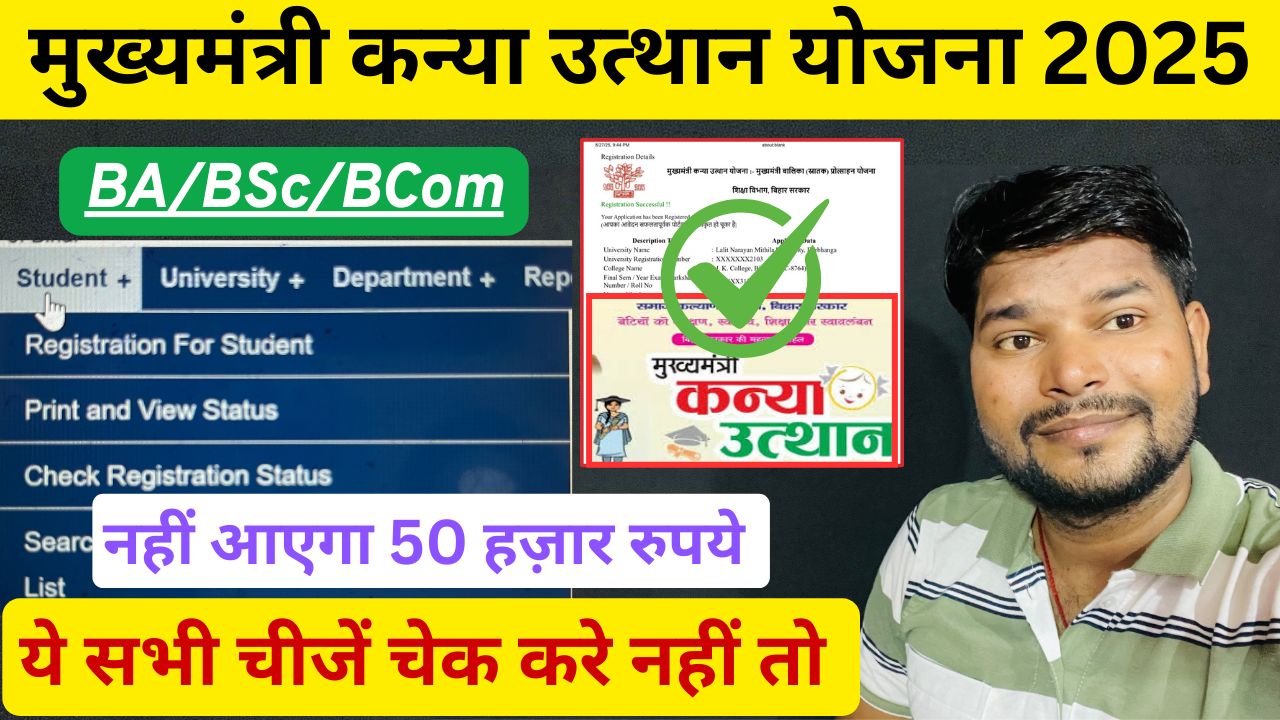 मुख्यमंत्री कन्या उत्थान योजना ( स्नातक पास ) के लिए ऑनलाइन आवेदन की प्रक्रिया शुरू कर दी है। जितने भी स्नातक पास छात्राएँ हैं जो 01/04/2021 से 31/12/2024 तक राज्य के अंगीभूत अथवा मान्यता प्राप्त संस्थान से डिग्री की परीक्षा पास की हो और अभी तक कन्या उत्थान योजना ( स्नातक पास ) का लाभ नहीं मिला है तो नीचे दिए लिंक से आवेदन जितना जल्दी हो कर दीजिए। और जो अनलाईन रेजिस्ट्रैशन कर दिए हैं अपना Registration Status चेक करते रहिए चेक करने का भी लिंक नीचे दिया गया है।